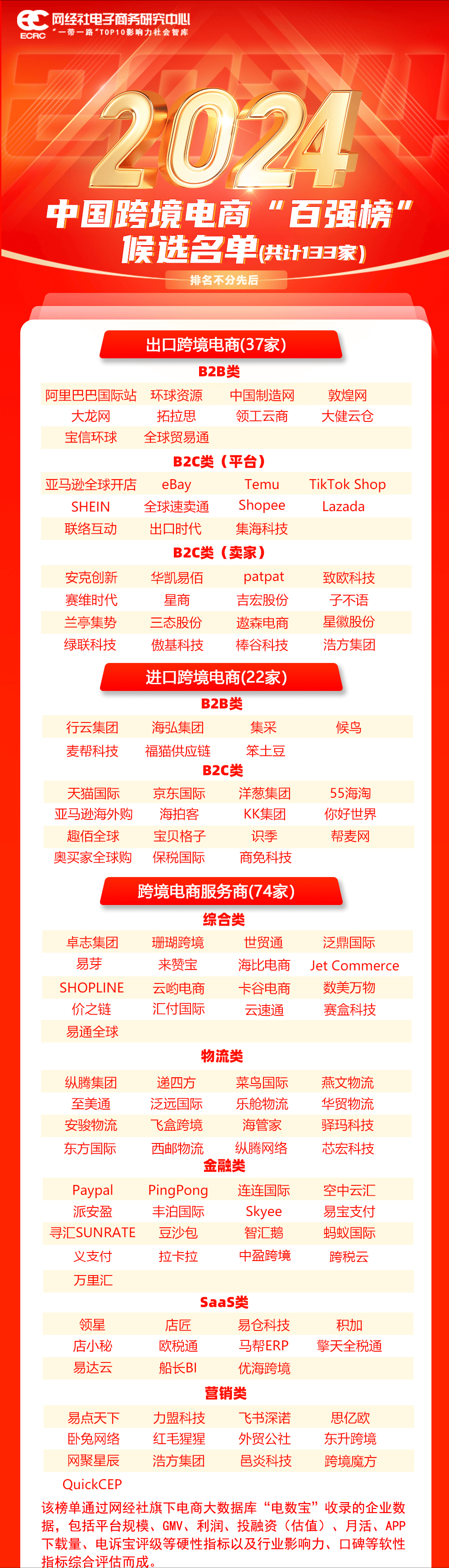 2)B2C类(平台):亚马逊全球开店、eBay、Temu、TikTok、全球速卖通、Shopee、Lazada、Wish、联络互动;3)B2C类(卖家):SHEIN、安克立异、华凯易佰、patpat、致欧科技、赛维时代、星商、吉宏股份、子不语、兰亭集势、三态股份、傲基、遨森电商、跨境通、有棵树、星徽股份、绿联科技;二、进口跨境电商类:1)B2B类:2)B2C类:天猫国际、京东国际、洋葱集团、55海淘、亚马逊海外购、海拍客、KK集团、你好世界;三、跨境电商办事商类:1)分析类;2)物流类:纵腾集团、递四方、菜鸟国际、燕文物流、至美通、泛远国际、乐舱物流、华贸物流、安骏物流、飞盒跨境、海管家、驿玛科技;3)金融类:Paypal、PingPong、连连国际、空中云汇、派安盈、丰泊国际、Skyee、易宝领取、寻汇SUNRATE、豆沙包、智汇鹅、蚂蚁国际、义领取、拉卡拉;4)SaaS类:领星、店匠、易仓科技、积加、店小秘、欧税通、马帮ERP、擎天全税通、易达云;5)营销类:易点全国、力盟科技、飞书深诺、思亿欧、卧兔收集、红毛猩猩、外贸。【小贴士】网经社深耕数字经济行业近20年,持久关心跨境电商,旗下跨境电商台办事的客户:亚马逊、eBay、SHEIN、行云集团、跨境通、卓志、大健云仓、大龙网、敦煌网、递四方、考拉海购、Temu、菜鸟收集、百事泰、思亿欧、海航集团、阿里巴巴等。网经社跨境电商台是专业跨境电商门户,关心出口跨境电商、进口跨境电商、跨境电商办事商(跨境物流、跨境领取、跨境手艺、跨境营销等)、跨境政策、跨境园区等,演讲榜单、供应链融资、营销、培训等办事,是跨境电商从业者、、投资者、用户的首选平台。